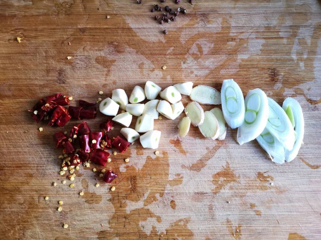 3. 大葱斜刀切段,姜切片,大蒜一切二,干辣椒洗净切小段备用。