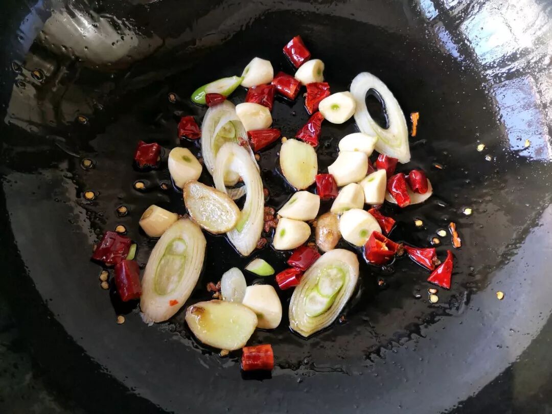 13. 锅里留适量底油,下入葱姜蒜干辣椒花椒爆出香味。