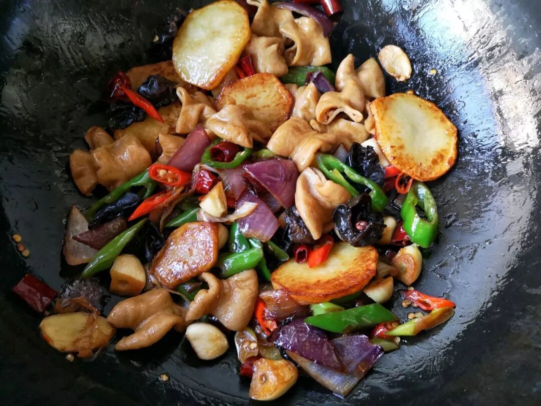 16. 大火翻炒至肥肠上色,汤基本收干。
