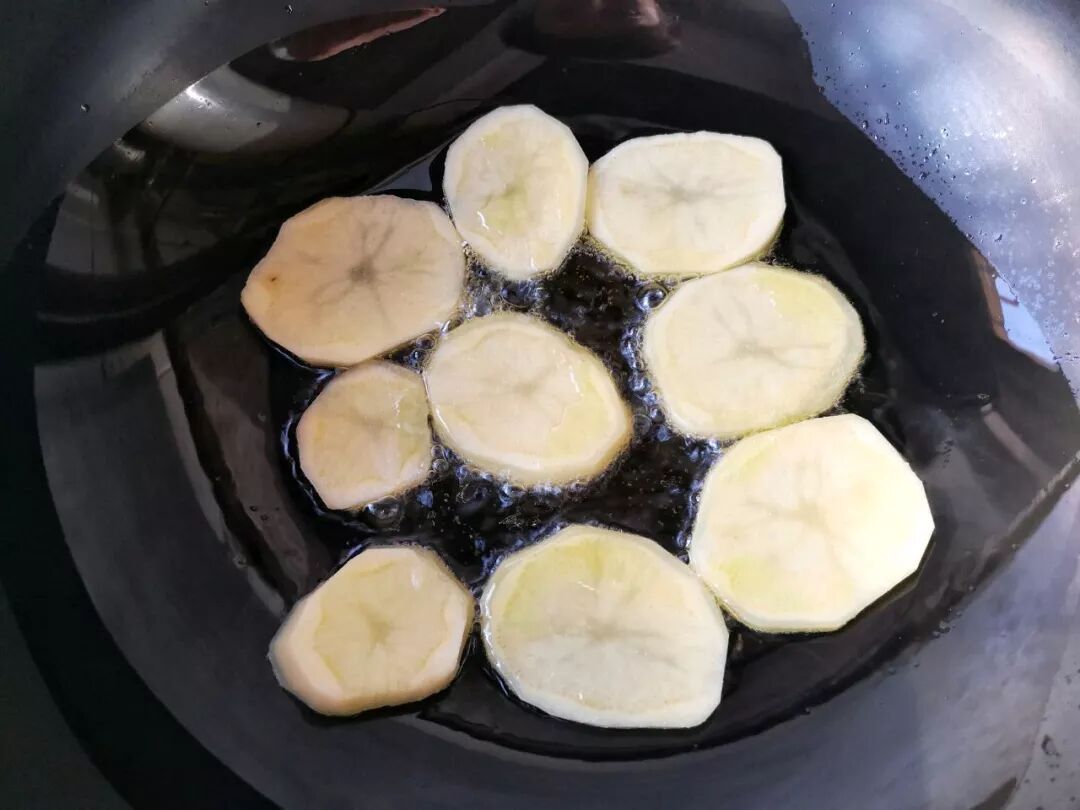 8. 锅中适量油,比平时炒菜多一点就行,下土豆片中小火慢煎。