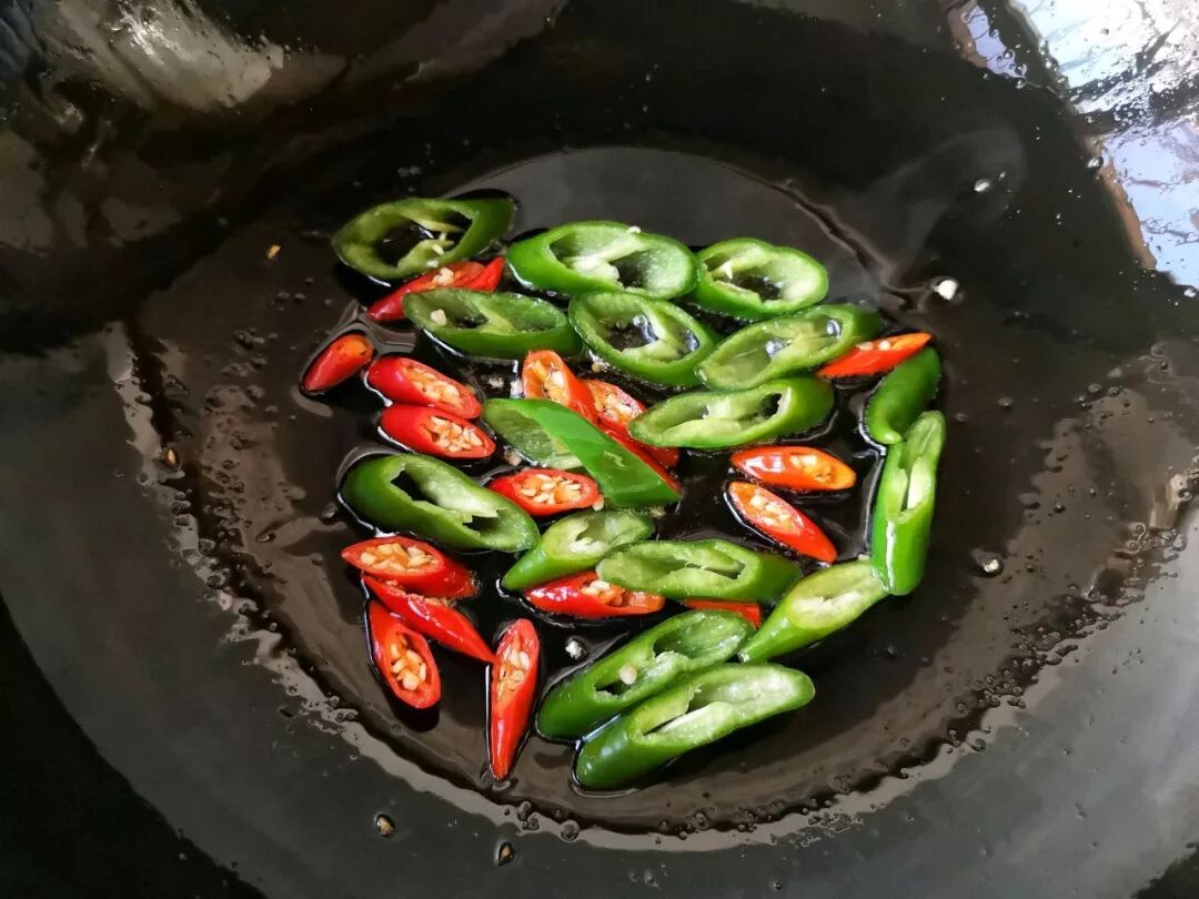 7. 青椒、小米椒洗净后切段。