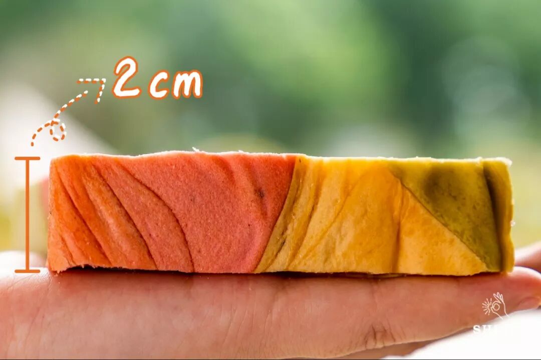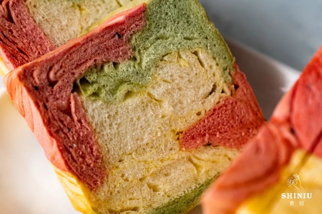 像彩虹一样绚丽的三色吐司,可以吃出三种不同的味道,甜度从低到高:抹茶绿、蛋黄、火龙果红。