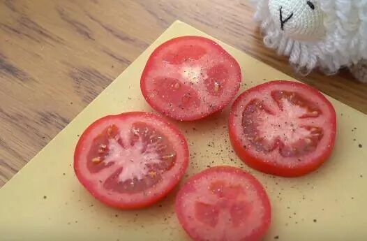 把2个番茄分别切成4片。撒上盐、胡椒、糖放置一段时间,排出多余的水分和酸味。有厨房纸垫在下面就更好了。