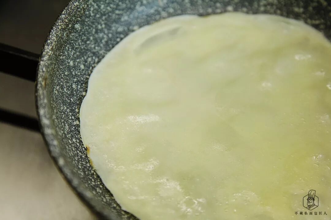 10、等锅微微热,用勺子把面糊倒入锅中,转动锅子,使面糊铺满这个锅子。