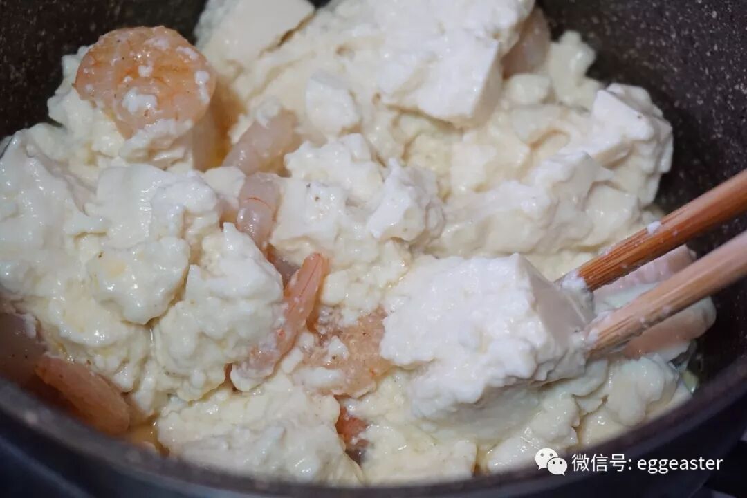 捣碎之后的豆腐在我那儿有一个特别传神的名字,「鸡刨豆腐」。没有完整成块状的嫩豆腐在嘴里烫、软、嫩的口感的确有些遗憾,但是对手上功夫的要求骤降到约等于零。