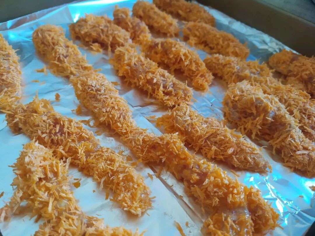 4. 裹一层淀粉,裹一层鸡蛋液,裹一层面包糠。