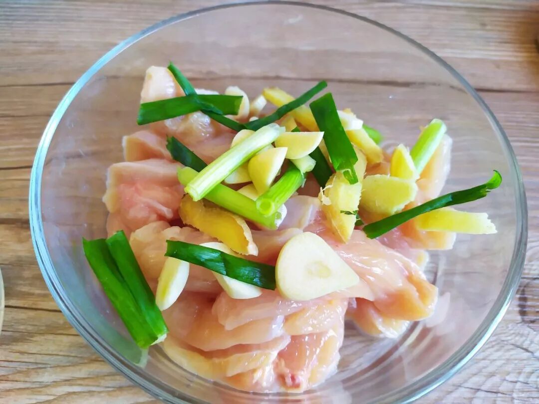 2. 蒜去皮,切成蒜片,再切姜丝和葱段。