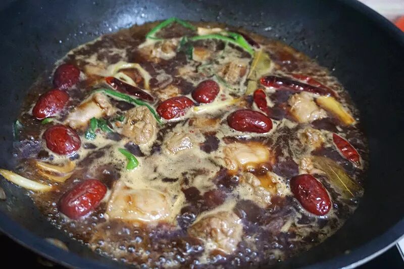 5. 放入红枣,加入没过食材的沸水,大火煮沸后转中火焖炖20分钟左右。