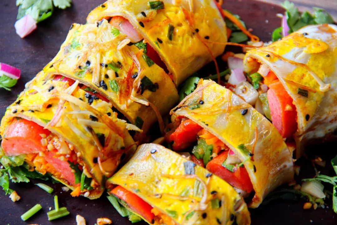 3.黄瓜刨丝加半茶匙盐腌15分钟,再挤出多余水份。胡萝卜刨丝后下锅炒软盛出。鸡柳和脆皮肠下锅煎熟。锅中放入油,然后放入冷面,加热到变软,然后打入一个鸡蛋,用铲子打散。然后撒上葱花,黑芝麻,金针菇,等到鸡蛋液凝固翻面。翻面刷上调好的酱汁,再撒入1勺陈醋,半茶匙白砂糖,撒上熟花生碎和芝麻,放上香菜,圆葱碎,香肠,鸡柳,黄瓜,胡萝卜丝,卷起来。最后切断装盘开吃。