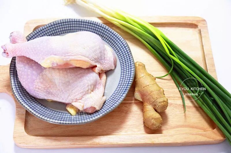 第一步:准备食材。鸡腿两根、香葱适量、姜适量。