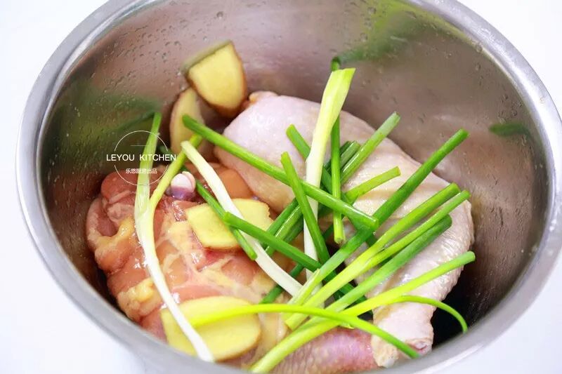 第五步:把姜片,香葱段放到鸡腿中,可以多在鸡肉表面擦试几下。然后,盖上保鲜膜,放到冰箱中冷藏腌制2个小时,让其更好的入味。