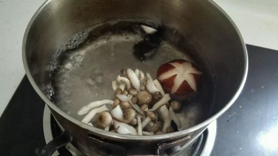 5. 木耳提前泡发,香菇切花,蟹味菇洗净去根。