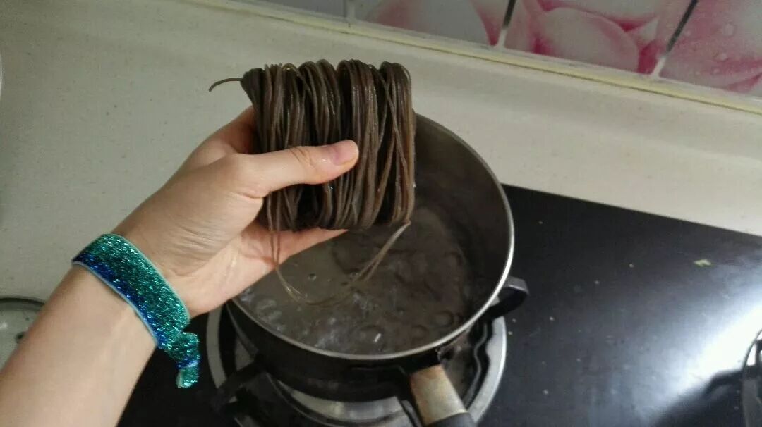 2. 锅里烧开水,把荞麦面搓散放进去。
