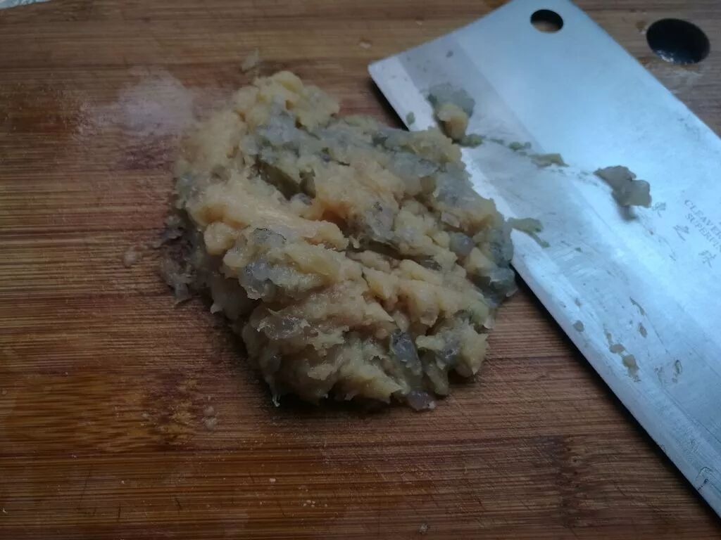 3. 鸡肉洗净剁成泥,加入鲜虾剁碎,不用太烂,有颗粒增加口感。