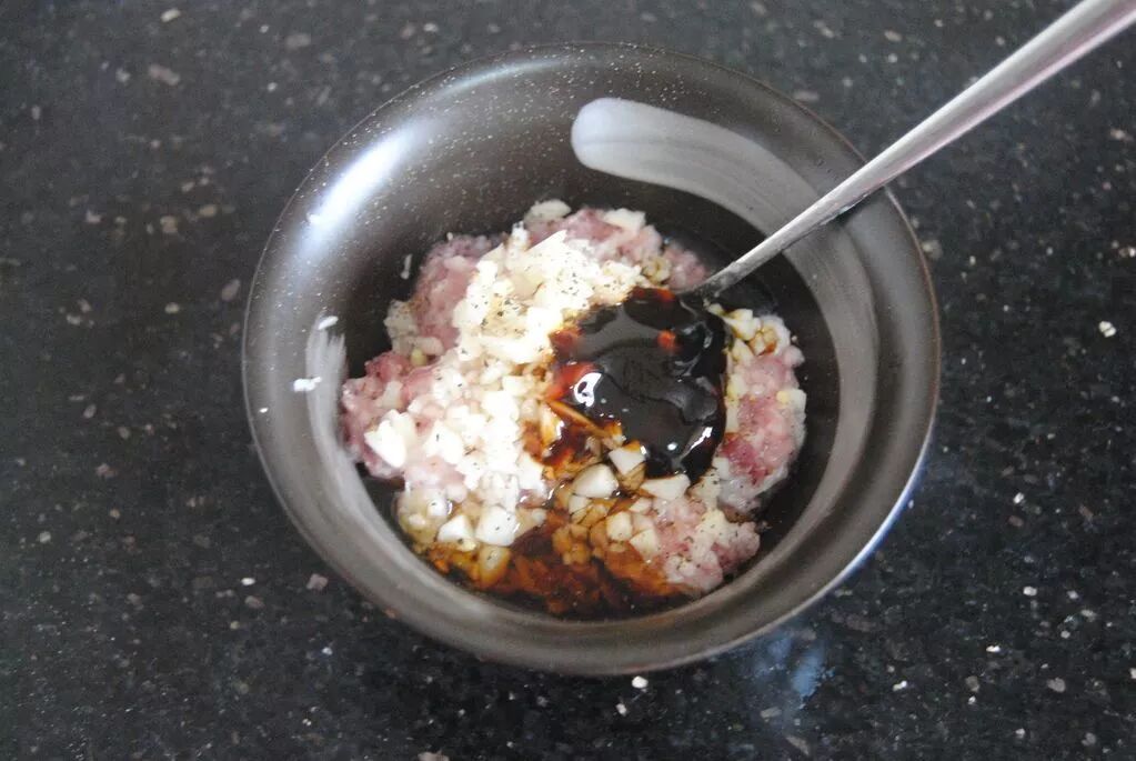 2. 猪肉洗净剁成肉糜,放入蚝油,胡椒粉,姜末,红薯淀粉,料酒。