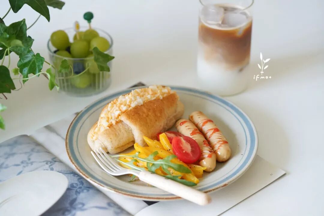 鸡蛋酱全麦盐面包+烤彩椒沙拉+煎鸡肉肠+提子蓝莓+冰百利甜燕麦奶拿铁