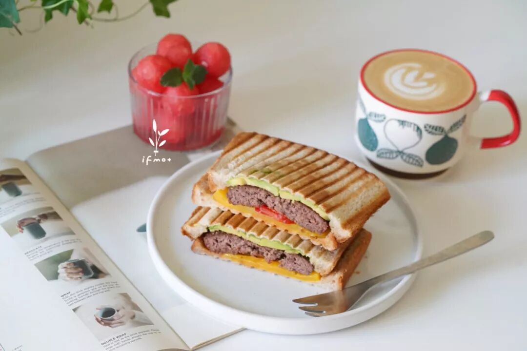牛肉饼彩椒牛油果帕尼尼+西瓜球+咖啡拿铁