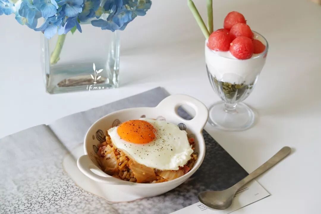 培根泡菜炒粗粮饭+煎蛋+抹茶granola西瓜球酸奶杯