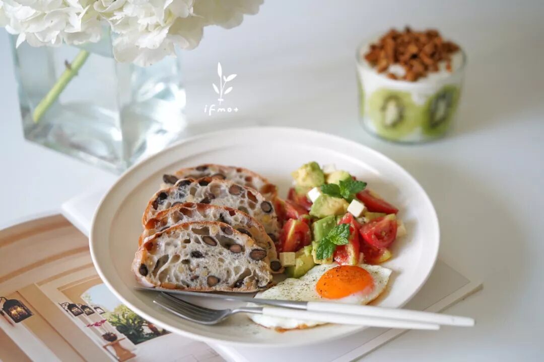 黑豆松仁恰巴塔+牛油果圣女果沙拉+煎蛋+奇异果granola佐酸奶