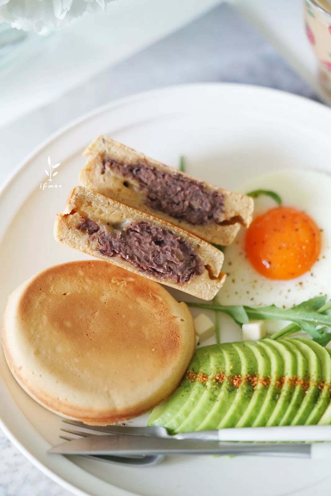 全麦吐司2片,自制红豆沙适量、鸡蛋1个,牛奶适量,海盐1小撮、黄油1小块