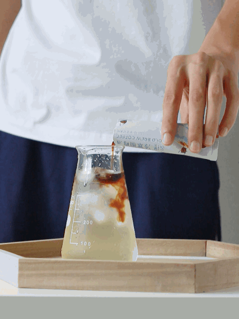 1秒撕开包装,将永璞咖啡液倒入冰水,花2秒时间,等深棕红的咖啡液扩散均匀,就可以喝了。简直比速溶还速溶,比胶囊机还方便。