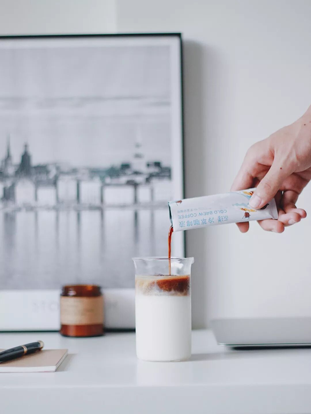 工作日的早晨,在公司楼下便利店买袋牛奶,撕开永璞冷萃咖啡液,倒进去搅一搅就是拿铁了呀。如果是冰牛奶加上冰块,还可以做出coffee dirty。