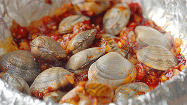 花甲粉得是锡纸包的,导热快,食物也能充分熟透入味。把锡纸窝成个碗的形状,直接放在火上煮开,豆瓣酱香、辣椒微呛,花甲在热汤里噗噗开了嘴,蒜蓉的滋味全渗进辣油油的汤里来,封口锁味的锡纸一打开,原本走禁欲路线的酥饼,也吸着鼻子狂嗅起来。