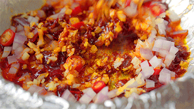 5、倒油,让锡纸碗里底部铺满油,先用中小火把2勺郫县豆瓣酱炒出红油。