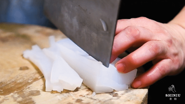 四川凉粉有白凉粉、米凉粉,还有绿豆做的片粉。今天我吃到的就是片粉,阿姨麻溜的将凉粉块片成凉粉细条,更容易入味。