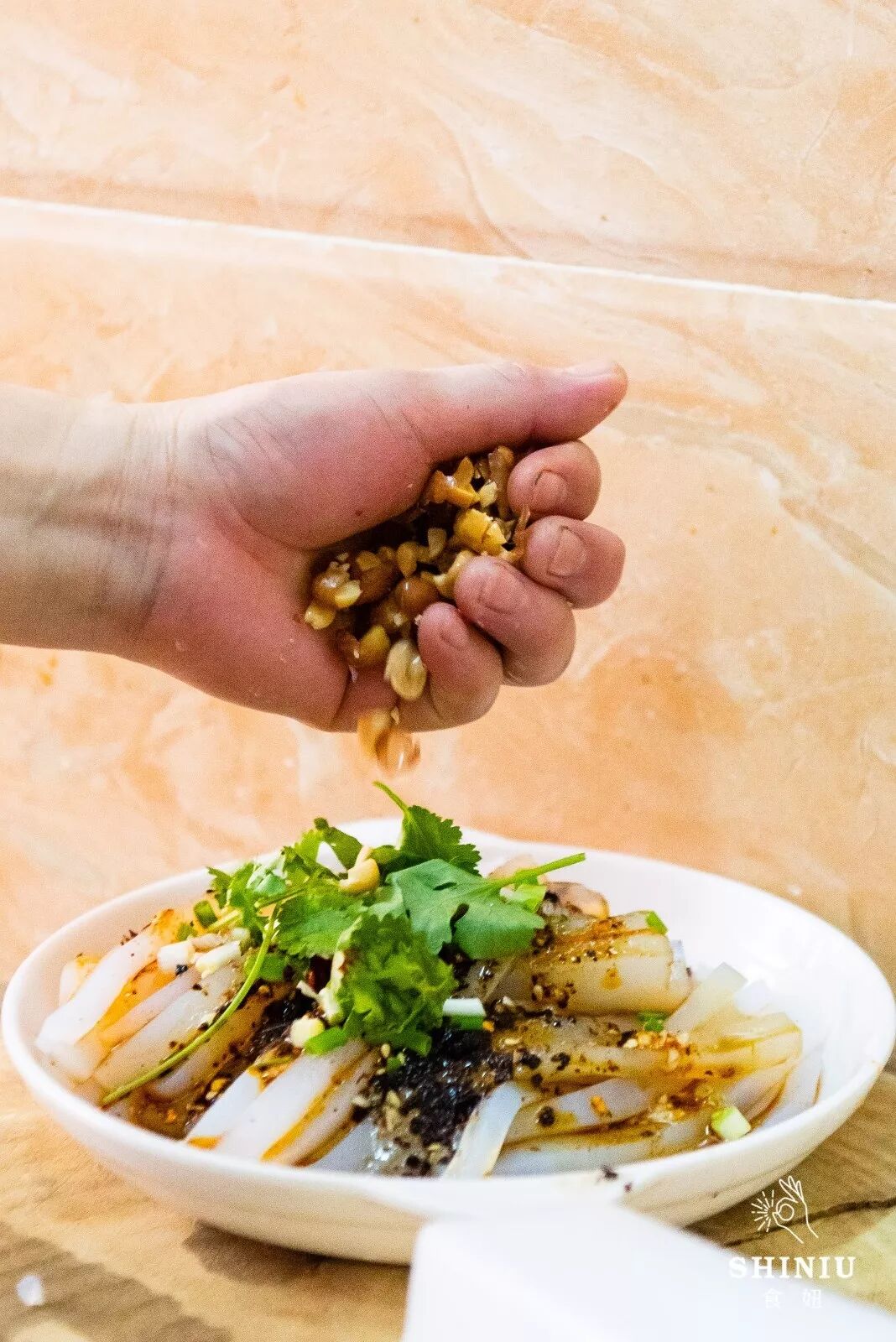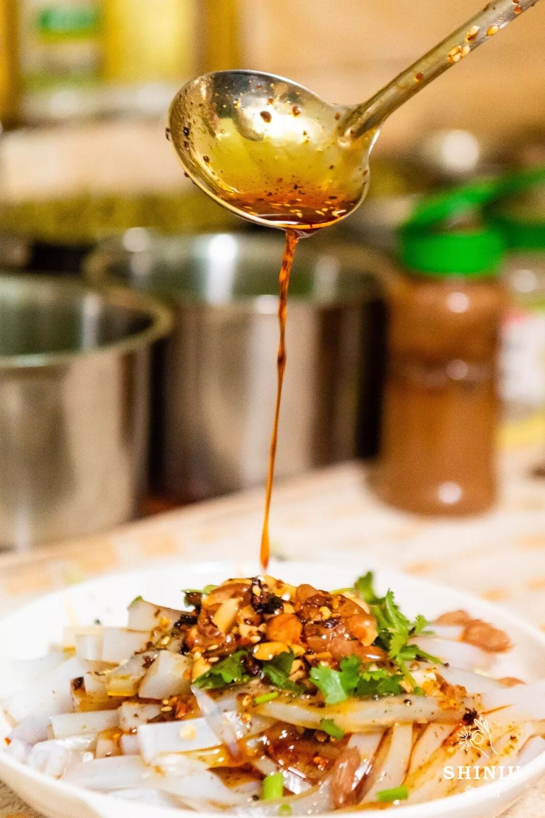 淋满了调料的凉粉很嫩,基本上一夹就烂。裹一层红油,吸溜一口,都不带嚼的!