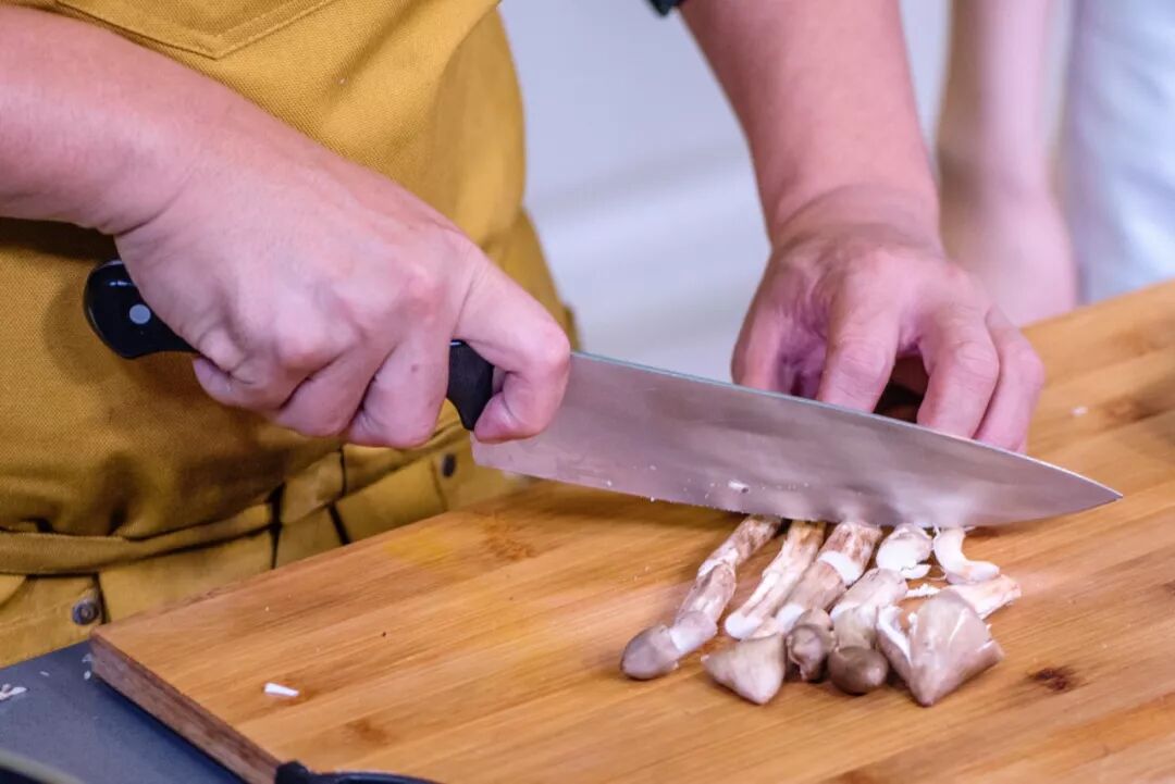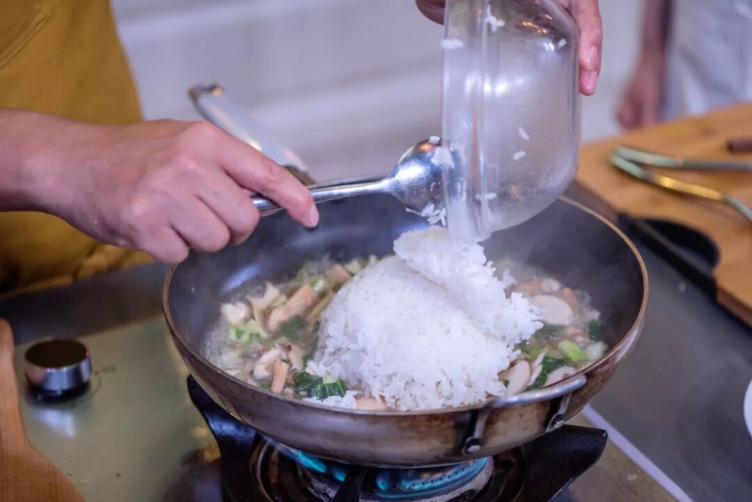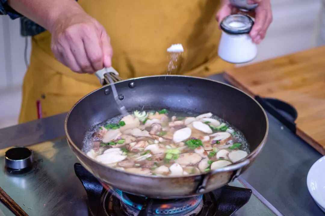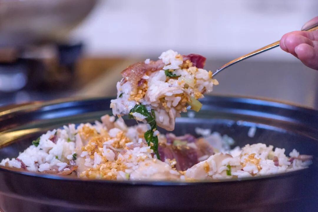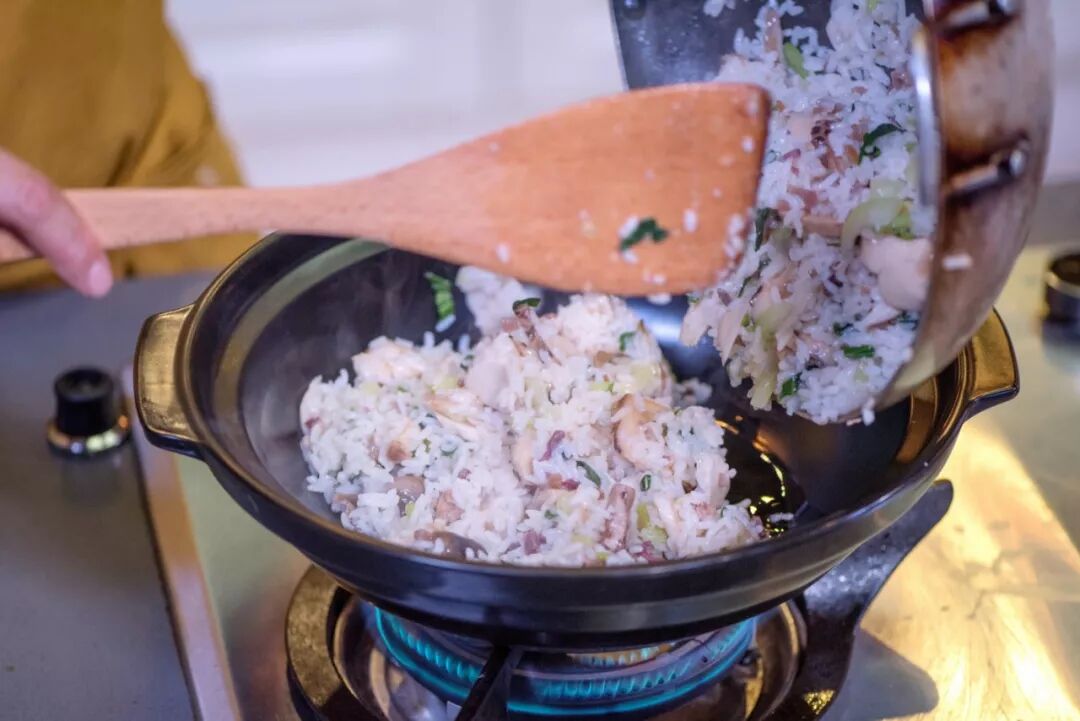 今天的这道菜师父用到了两种珍品菇子,万中选一的天白花菇和一年一遇的鸡枞菌,任何菇子都有自己独特的香味,很容易出味也容易吸味,鸡枞和花菇把火腿的油脂香都吸收了,再释放出来不仅有菌鲜味,还有火腿的醇香。最后,菜饭倒入砂锅里煨煮,将菜的甜味跟菇和火腿的香气融入到饭里,再加一点蒜酥,让菜饭吃起来多了一个酥脆感,这样的味道组合起来会更奇妙,大家一定要试试看哦~