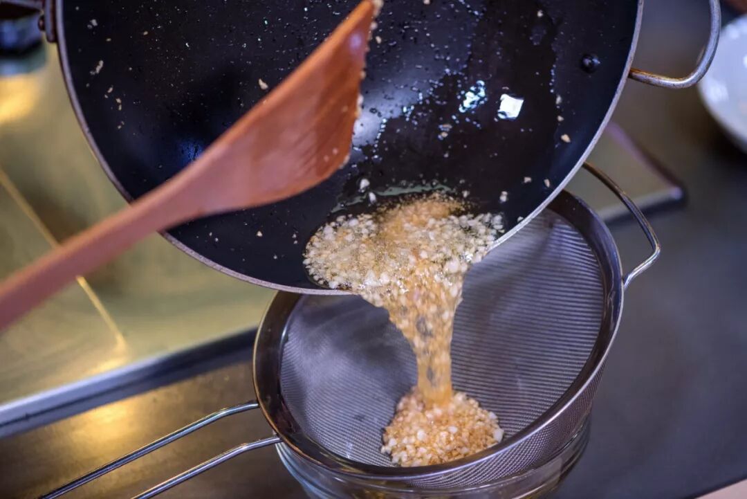 出锅后蒜酥会继续导热,避免煸太熟蒜头会发苦