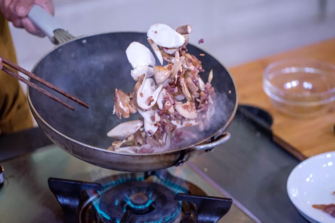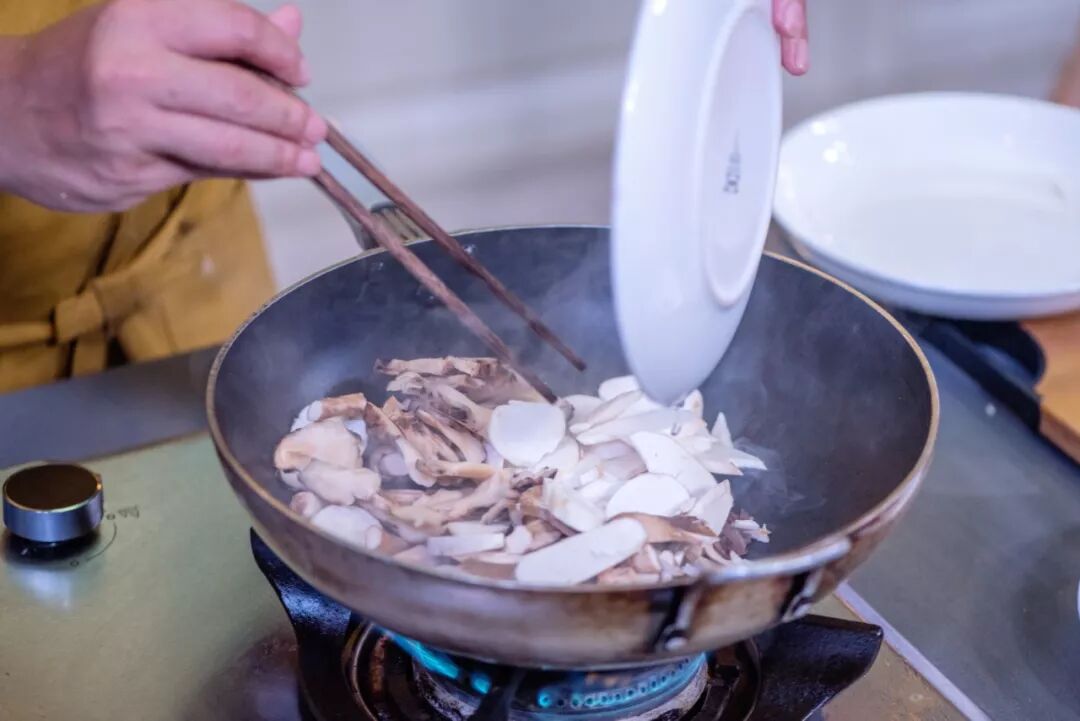 把切好的鸡枞菌和花菇放进锅中煸炒。