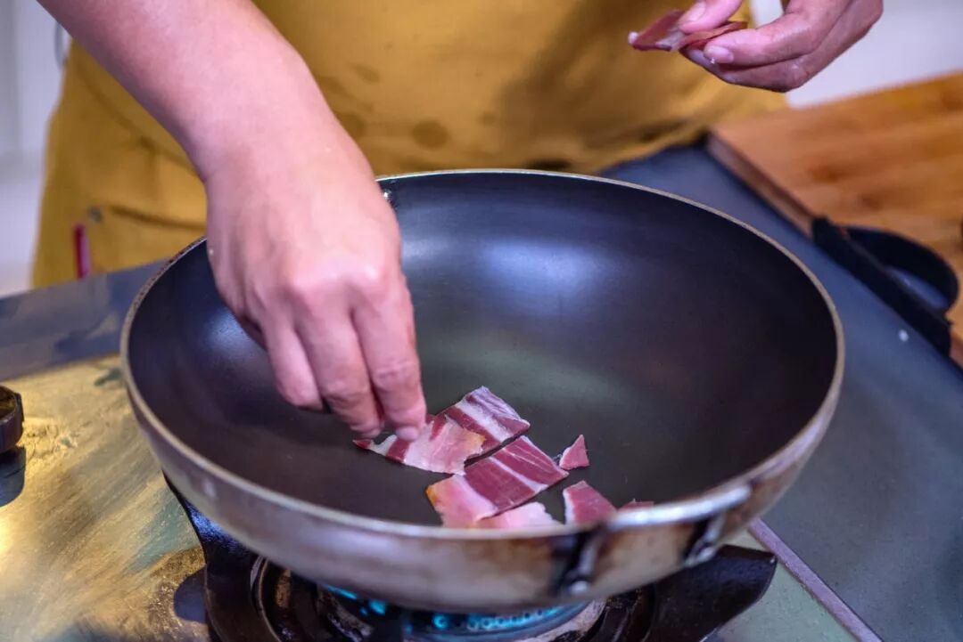 把切好的火腿片放入锅中煎,煎至油脂出来即可出锅。
