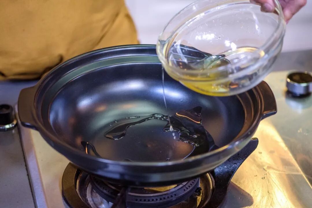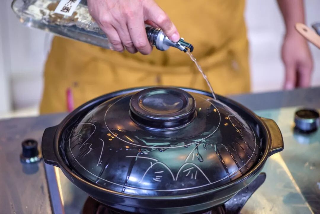 盖上砂锅盖,在盖子上撒一圈清酒。
