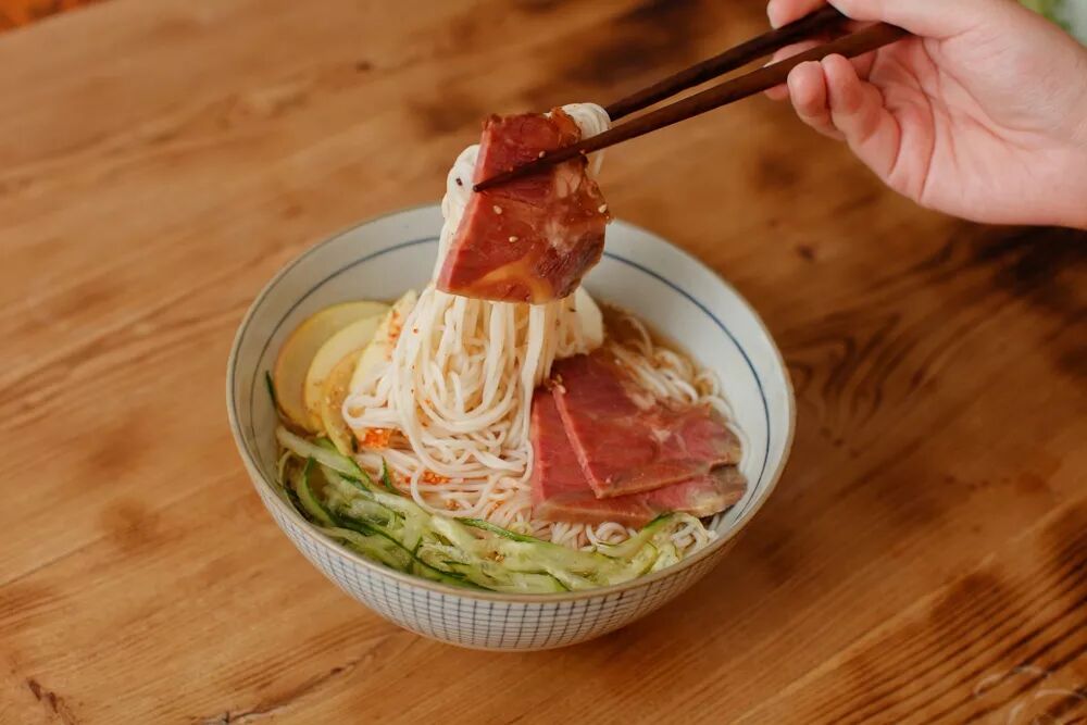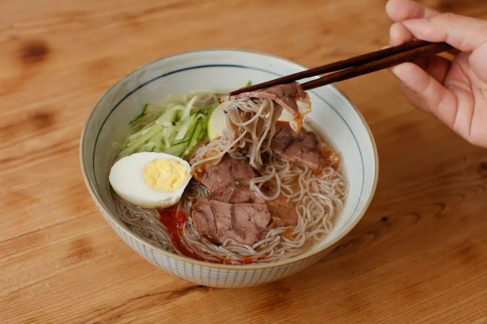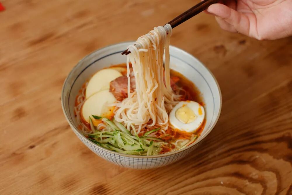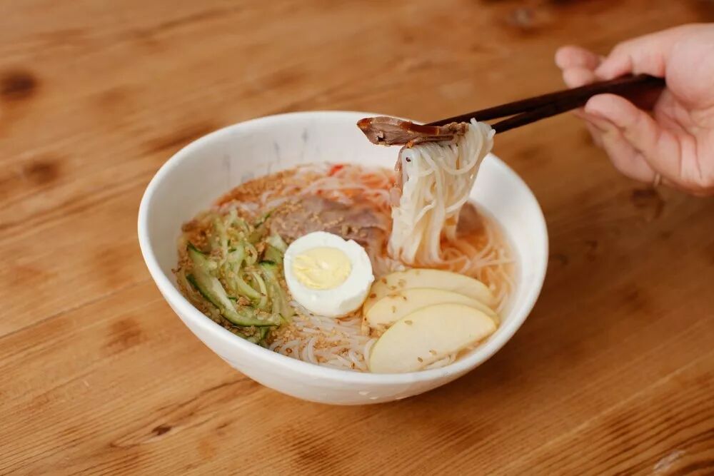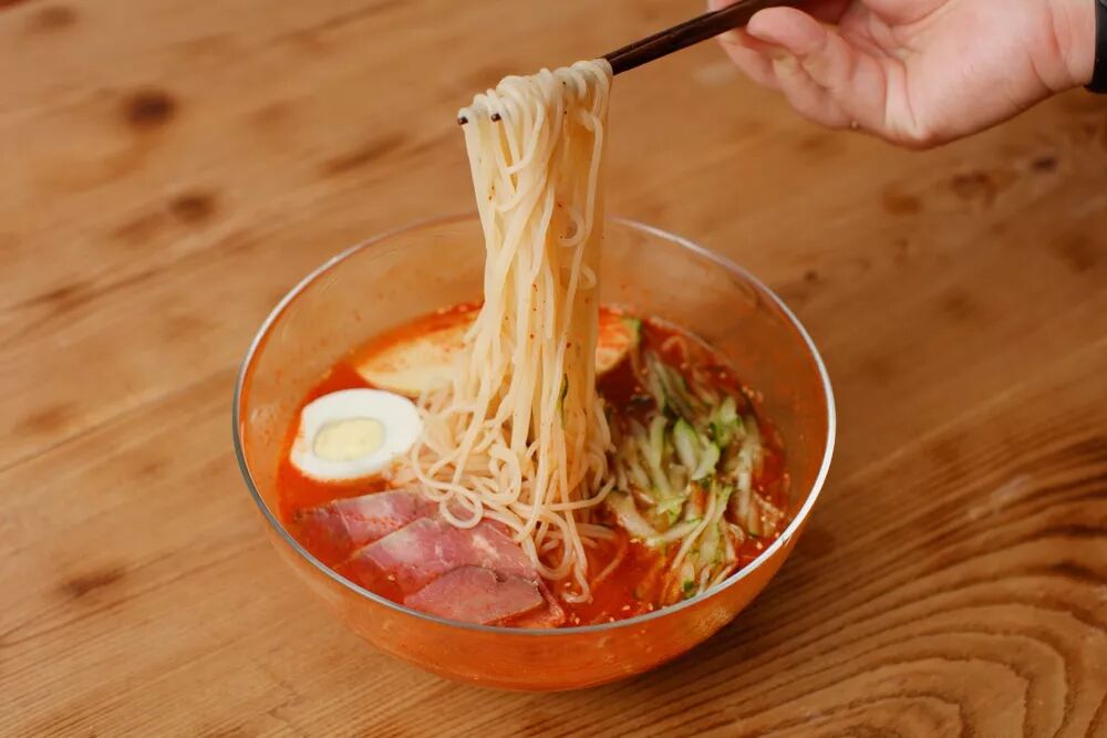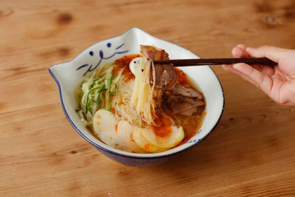 此外,冷面的吃法也有先后之分,据说朝鲜族吃冷面的顺序一般是先喝汤,再吃面,有些地方因为面条非常筋道,一般吃的时候会用剪刀来剪面。