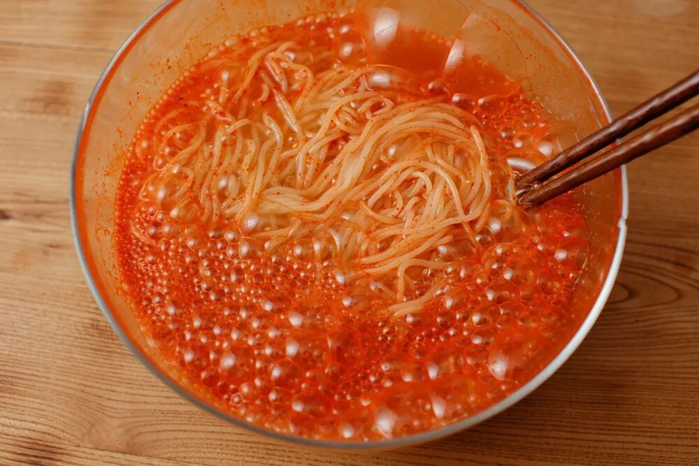 当你把粉料包倒入汤汁中,会产生大量气泡,仿佛是在做化学实验,口味以咸鲜为主,既没有韩式冷面较浓的泡菜味,也不像酸甜口冷面那么清亮。