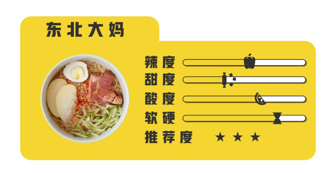 特别要提一下包装部分的制作说明,别的冷面会详细的告诉你,面煮几分钟,浸泡几分钟,汤汁调配多少毫升水,而东北大妈十分随性的只是告诉了你基本步骤,但具体的时间与比例,大都用“感觉差不多”类似的词语表示,一边看制作说明,脑海中不自觉就会呈现出一张善意的东北大妈的笑脸。