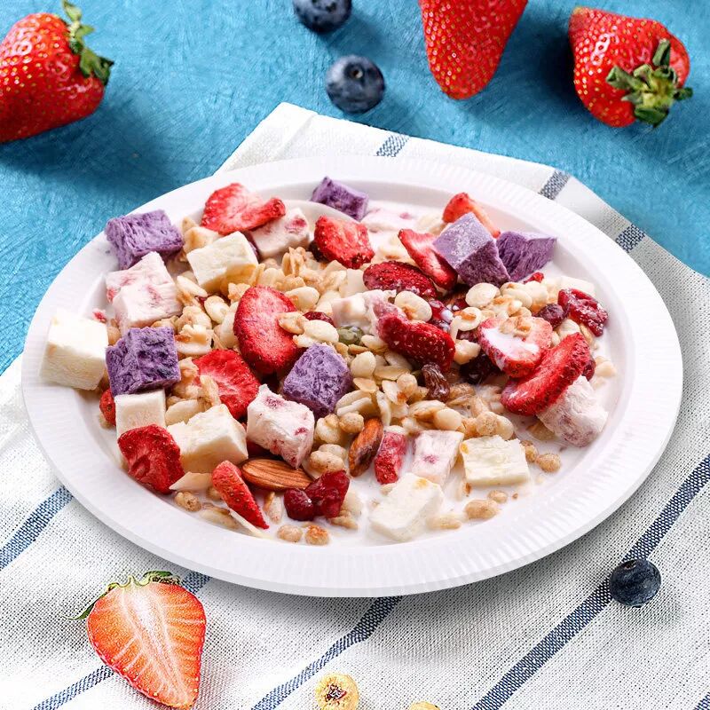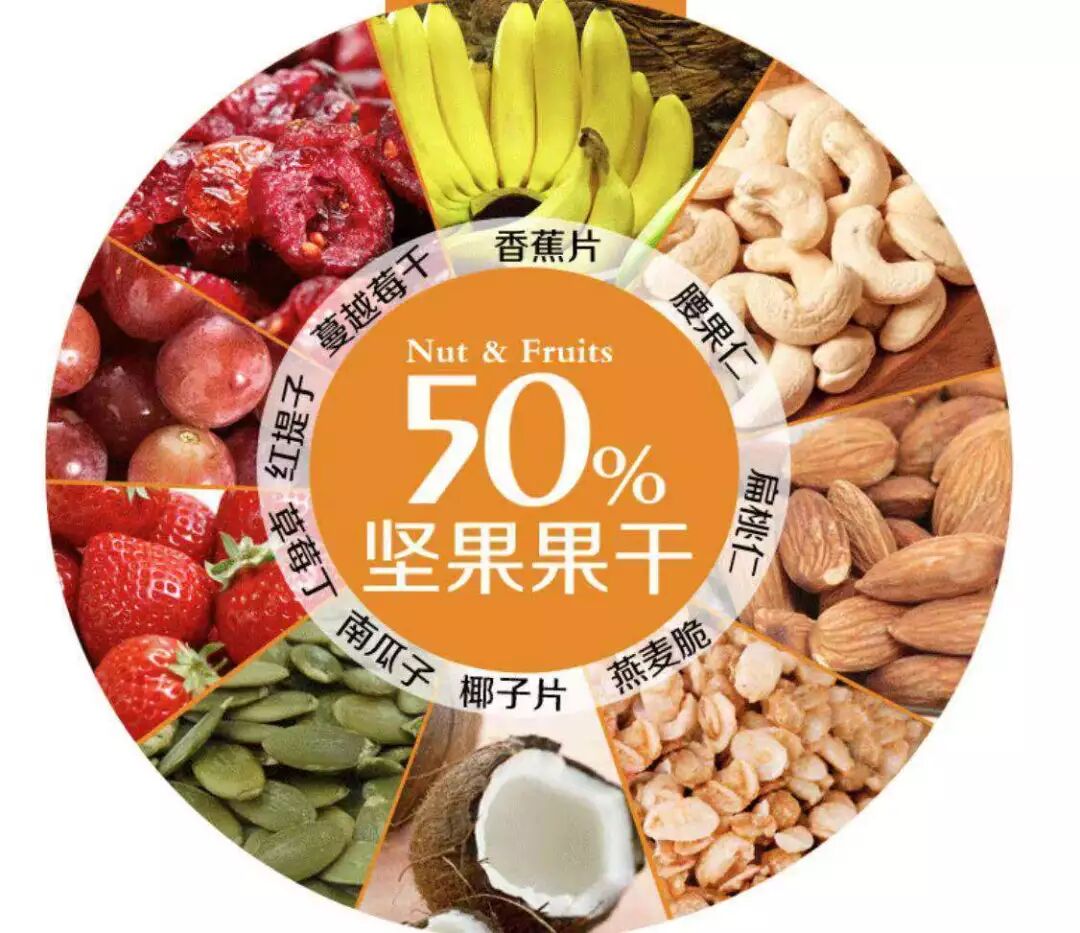 水果麦片把充满维生素C的果干(草莓丁、香蕉片等)和营养丰富的干果(扁桃仁、腰果仁等)进行1:1的科学搭配。