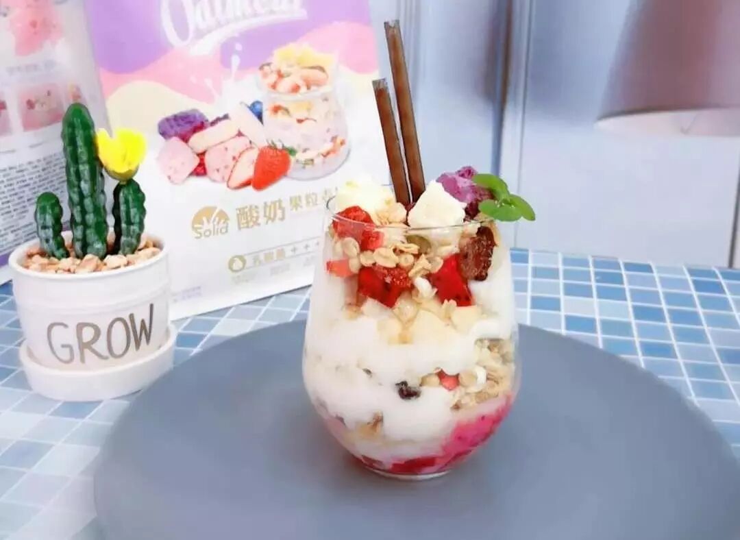 在杯子里撒上一层麦片倒一层酸奶再加几片水果,一杯脏脏奶茶就做好了!