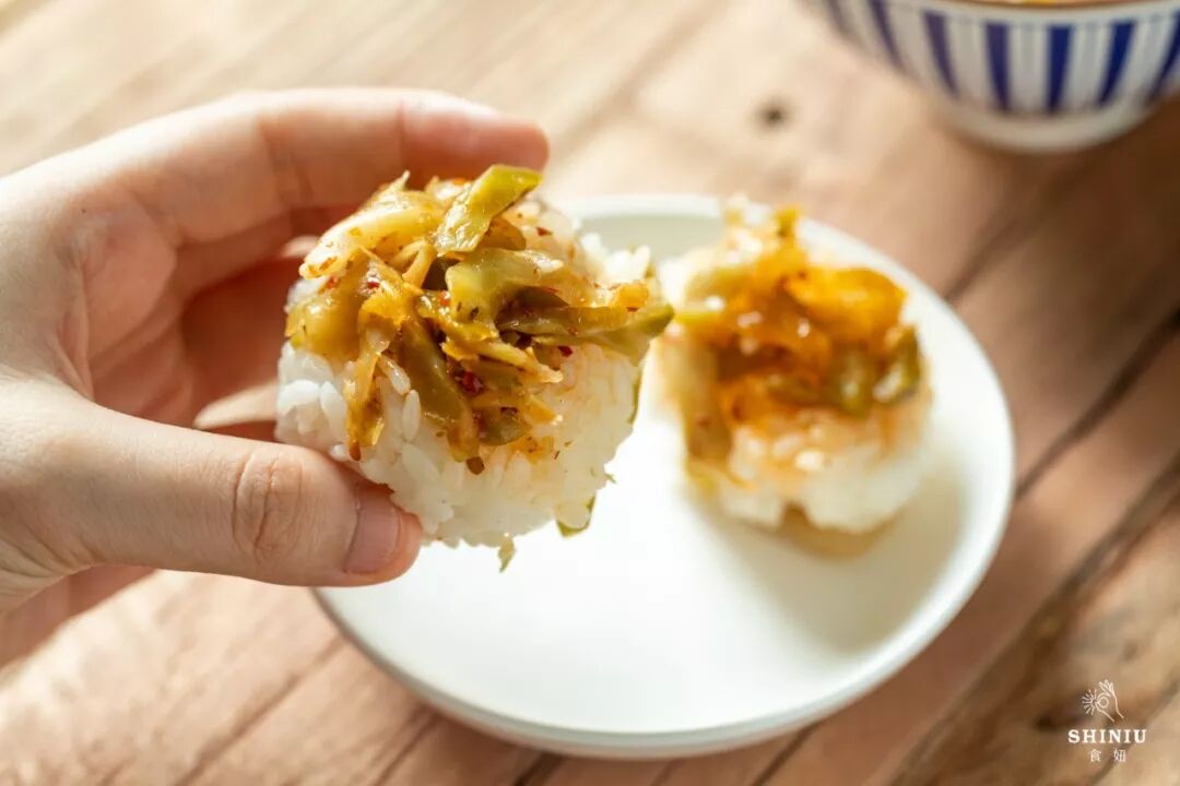 有榨菜,有米饭,别光想着榨菜炒饭,饭团才是最简单快手的做法。不开火无油烟超环保,即捏即食超省事,事后清理战场也比较容易。