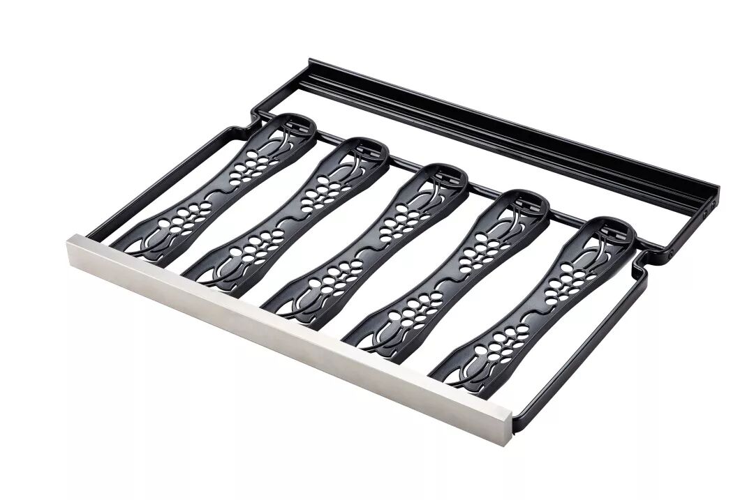 抽拉顺畅,设计有效。酒柜层架设置不再单方面使用普通呆板的木层架或金属层架,而是在二者巧妙结合的基础上将全金属结构赋予镂空葡萄图腾设计,抽拉顺滑的同时又兼具美观雅致的内涵。