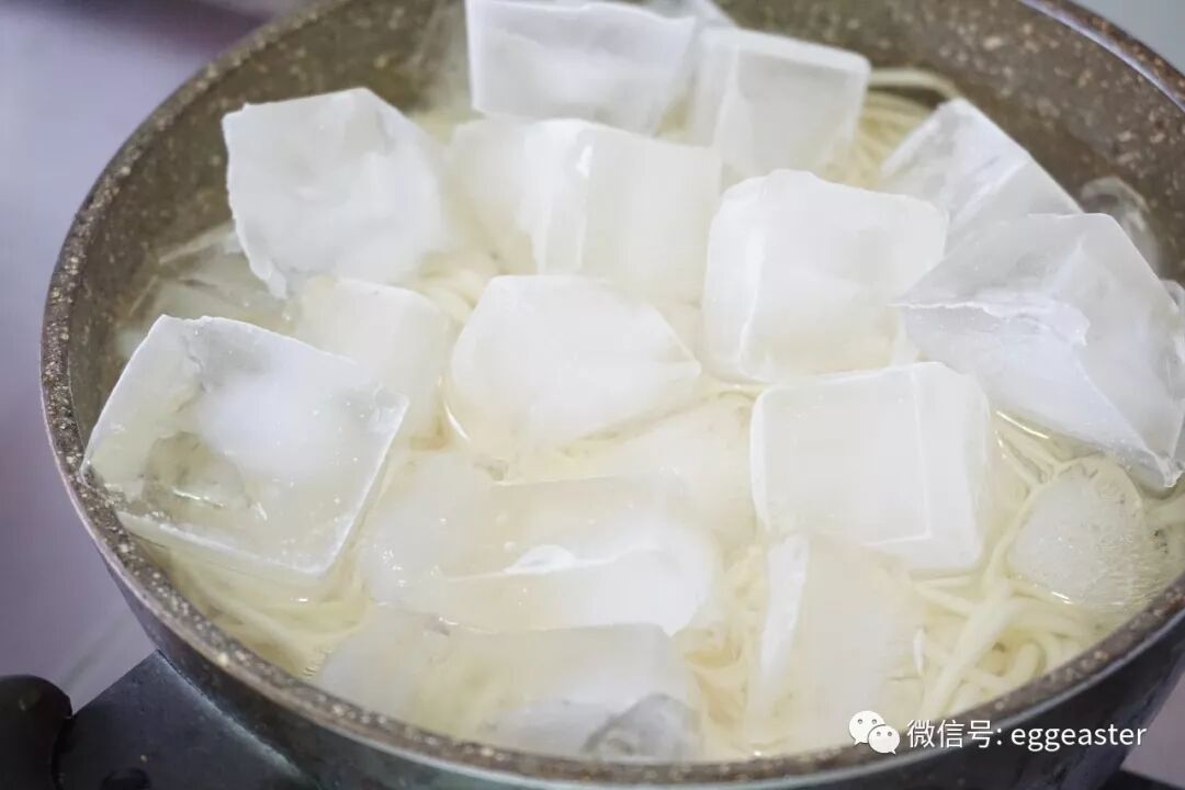 锅里水烧开煮面,面煮熟之后过一遍冷水,再在足够冰的冰水里浸泡上,让面条完全冷却的同时变得Q弹。