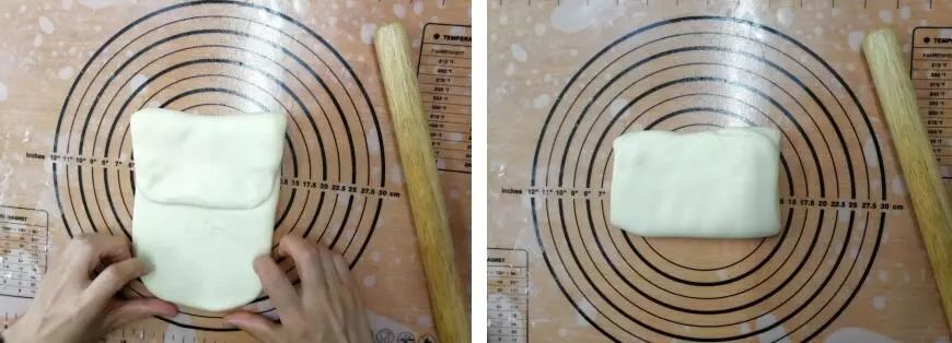 ③从上往下折叠,再从下往上叠起。也就是三叠,然后蒙保鲜膜,松弛10分钟。