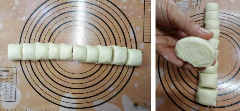 ⑤切成大小相等的剂子。(看下图切面,那个就是之后的分层啦)。