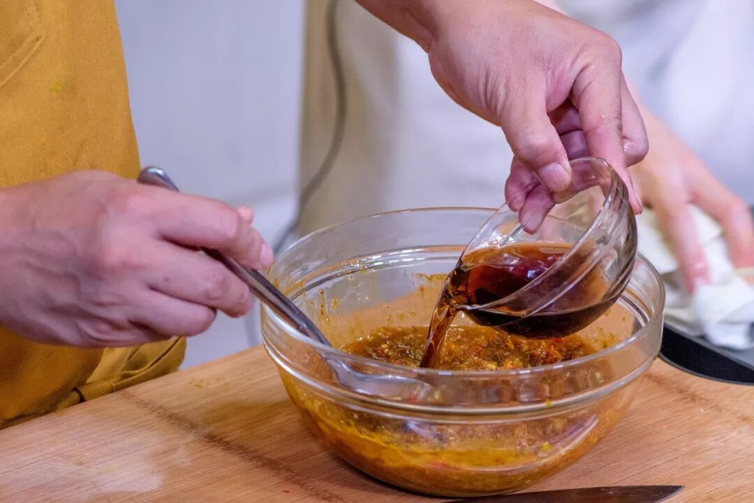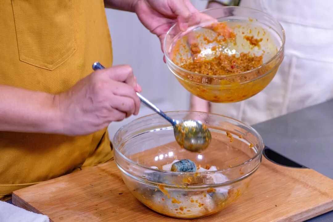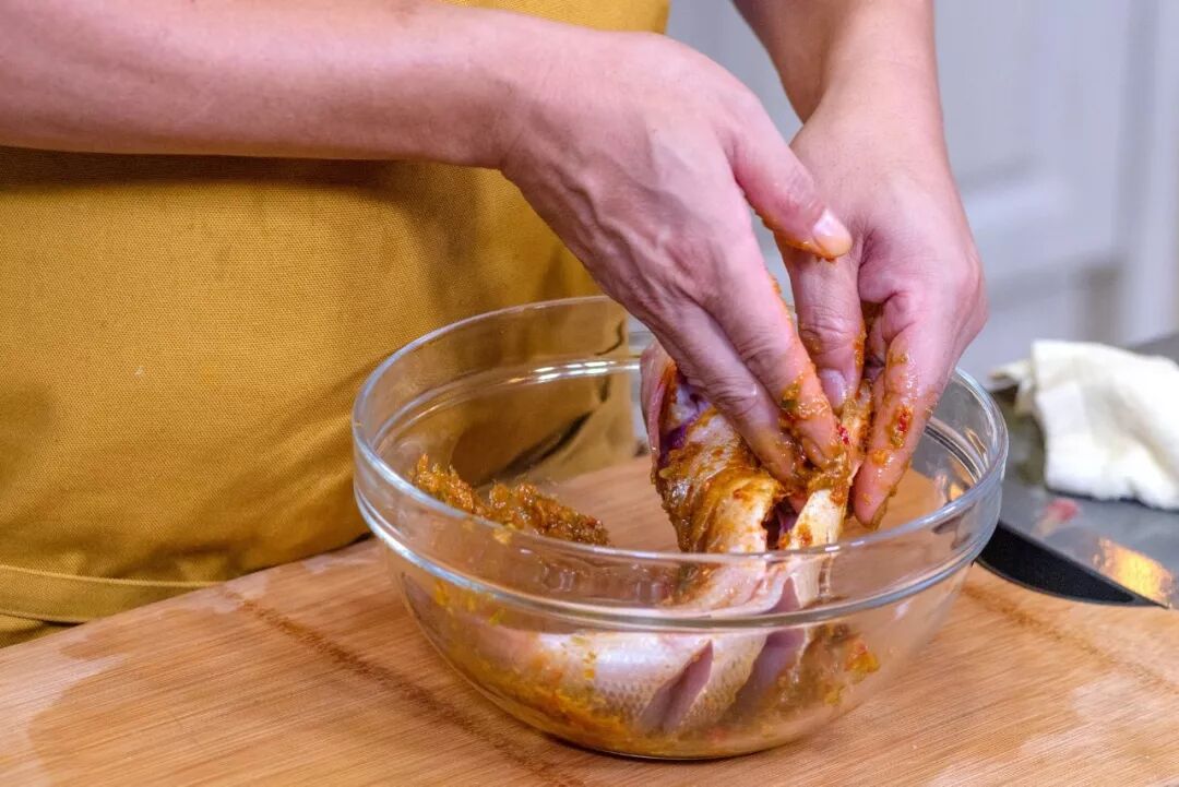 将处理好的鱼放进部分香料油碗中充分腌制。