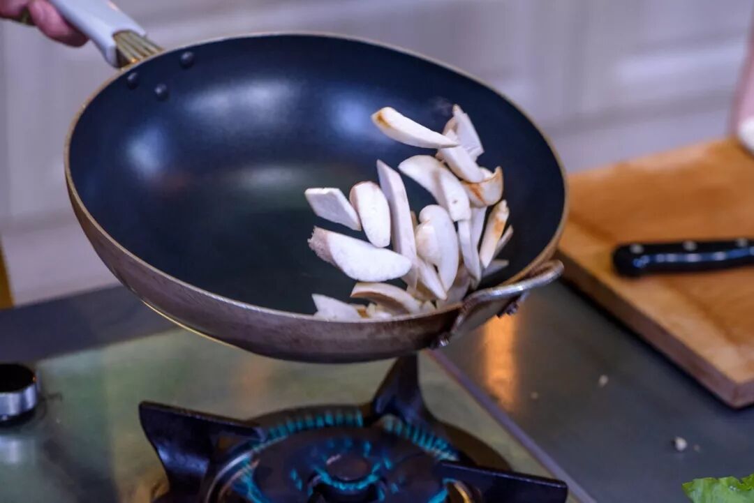 杏鲍菇切块后入锅煸炒。