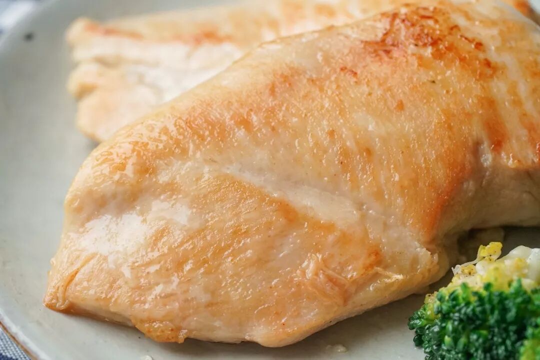 2、锅中放入少许油烧热,开小火下鸡胸肉煎至一面变白且带点金黄色。