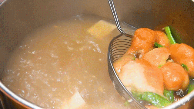 还有些事先炸好的炸物:热狗、鸡柳、鸡块……要在沸腾的高汤里打上几个滚,再放进碗里。