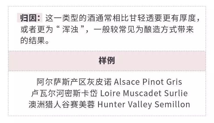 这一点我们之前在“酸型”中也提到过,确实随着陈年,白葡萄酒的酒体会逐渐变宽,变厚,例如我们在上面提到过得一些白葡萄品种,比如阿尔萨斯的琼瑶浆、隆河孔得里约的维欧尼,包括勃艮第的霞多丽,这些产区的品种尤为明显,陈年后产生的油润感和稠密感大大的增强了入口的表达力。但陈年的前提是,这些酒的质量要能够做到在陈年后不“散架”,所以当我们考虑到陈年的这个因素是,大部分也是对质量的判断了,毕竟我们之前也说过,大部分芳香性品种都会被酿造成更容易早饮的风格。
